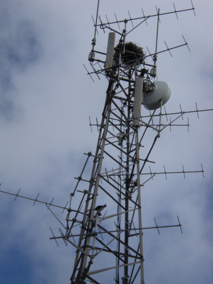 image Next → Osprey nest on communication tower next to Bremer Bay General Store. Osprey is part-way down tower