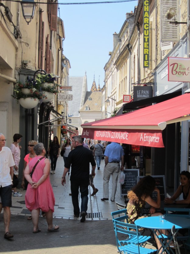 Happily, we were back in time to visit Notre-Dame de Dijon, where people have been praying for over ten centuries. The present gothic construction, built between 1220 & 1240, replaced a chapel founded in the middle of the 11th century, called Notre-Dame du Marche (Our Lady of the Market). Sections of the facade of the church were destroyed by revolutionaries. Legend has it that the reason there are just a few gargoyles left from the 13th century, is that a moneylender who had come to get married was crushed by one of the gargoyles falling from the facade and his colleagues had them taken down. In the 1800’s seven sculptors created new, false, gargoyles. The lovely thing about this cathedral was that there was a service in progress when we visited and the mass was sung. I am not a Roman Catholic so was not familiar with the words but it was a wonderful experience to be there. Afterwards we wandered around town (it was still very hot) and watched the children enjoying the water in the Place de La Liberation. Fruit for dinner – couldn’t be bothered going out again.